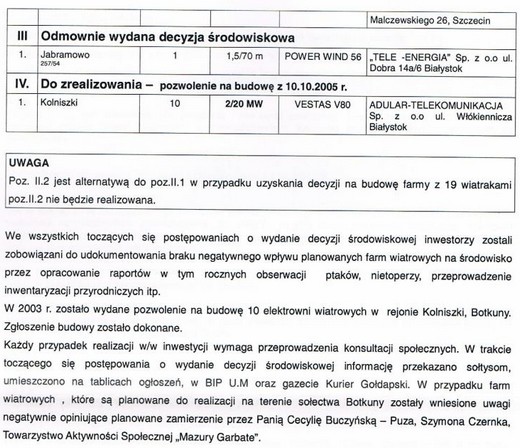 - ilość wiatraków z wyszczególnieniem faz inwestycyjnych,