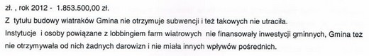- otrzymanych darowizn, finansowania inwestycji gminnych i wpływów pośrednich od osób i instytucji powiązanych z lobbingiem farm wiatrowych.