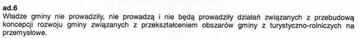6. Czy władze gminy (Burmistrz, Rada Miejska) prowadzą działania związane z przebudową koncepcji rozwojowych gminy związanych z przekształceniem obszarów gminy z turystyczno - rolniczych na przemysłowe? Na jakim etapie są te działania?
