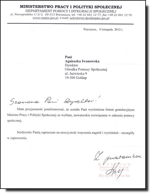 Pracę gołdapskiego Ośrodka Pomocy Społecznej i dyrektor Agnieszki Iwanowskiej docenia też minister pracy i polityki społecznej. 21 listopada w gmachu Ministerstwa Gospodarki odbierze ona list gratulacyjny za „wybitne, nowatorskie rozwiązania z zakresu pomocy społecznej".