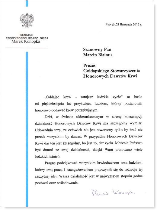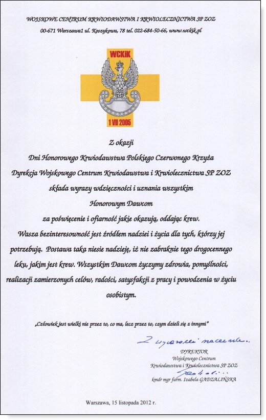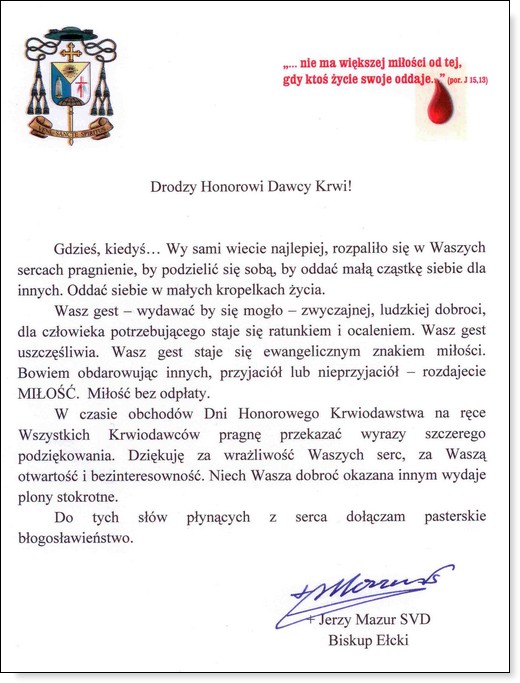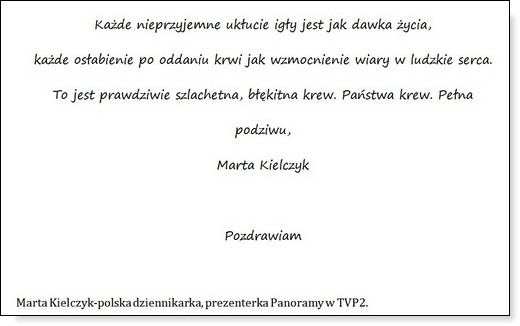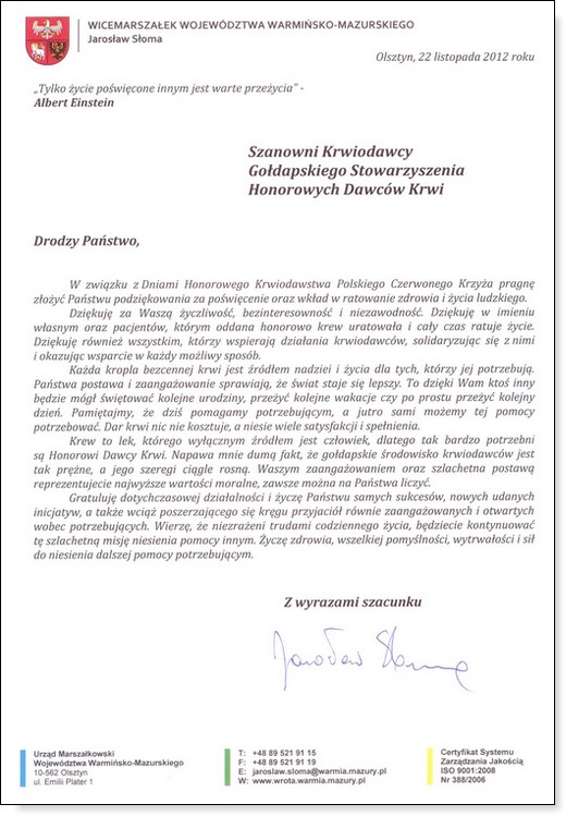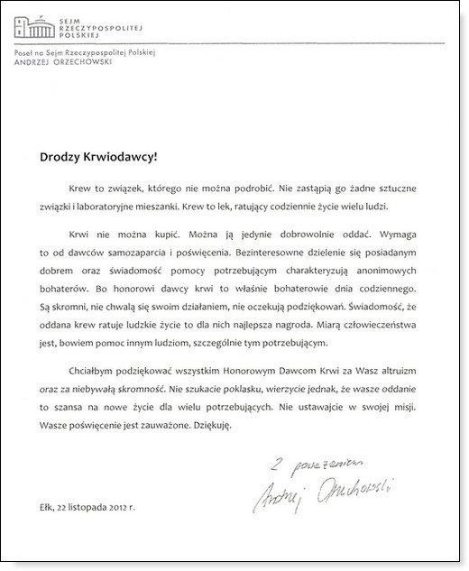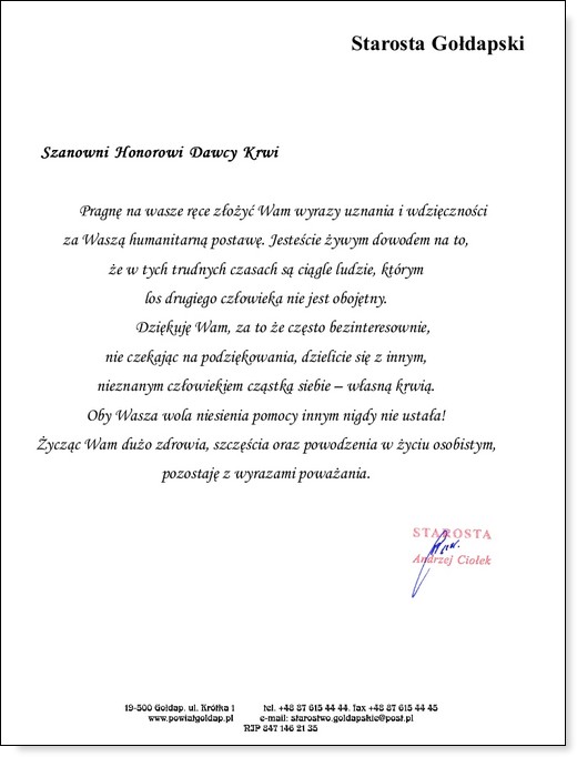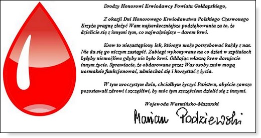 W dniach 22-26 listopada obchodzone są Dni Honorowego Krwiodawstwa Polskiego Czerwonego Krzyża. Jest to święto wszystkich polskich Honorowych Dawców Krwi i czas podziękowań. W dniu dzisiejszym Zarząd Gołdapskiego Stowarzyszenia Honorowych Dawców Krwi składa gorące podziękowania wszystkim krwiodawcom za bezinteresowny dar, ratujący zdrowie i życie drugiego człowieka. Na ręce stowarzyszenia wpłynęły też życzenia od innych osób dla gołdapskich krwiodawców, które za pośrednictwem GOLDAP.INFO przekazujemy dla Państwa.