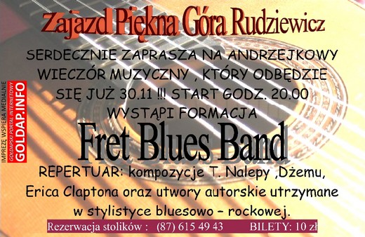 Zajazd Piękna Góra Rudziewicz i Portal GOLDAP.INFO zapraszają 30 listopada na andrzejkowy wieczór muzyczny. O godzinie 20.00 na żywo zagra zespół Fret Blues Band, który ma w repertuarze utwory m.in. Tadeusza Nalepy, Dżemu, Erica Claptona i własne kompozycje w stylistyce bluesowo-rockowej. Więcej informacji na plakacie.