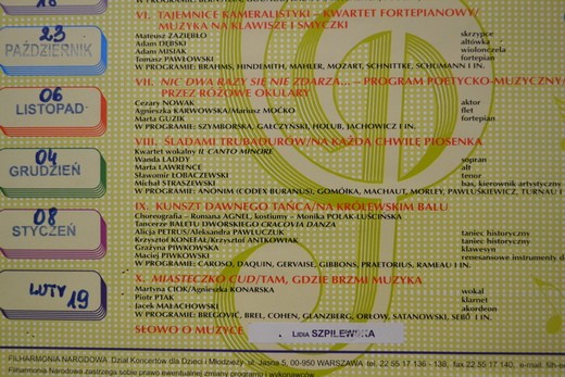 Dzisiaj w Państwowej Szkole Muzycznej odbył się kolejny koncert Filharmonii Narodowej. Tym razem wystąpił kwartet wokalny Il Canto Minore, a koncert nosił tytuł „Śladami trubadurów/na każdą chwilę piosenka". W programie znalazły się pieśni takich artystów jak Turnau, Pawluśkiewicz, Gomółka, Machaut, Morley, Anonim (Codex Burnaus).