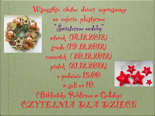 Czytelnia dla dzieci w Bibliotece Publicznej w Gołdapi zaprasza najmłodszych na zajęcia plastyczne „Świąteczne ozdoby". Odbywać się one będą w dniach 18-21 grudnia, każdego dnia od godziny 15.00.