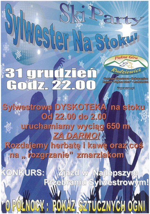 Jeśli nie mają państwo pomysłu na spędzenie sylwestra to Centrum Sportowo-Rekreacyjne Piękna Góra Rudziewicz przygotowało ciekawą imprezę. Podczas niej będzie można połączyć zabawę ze sportem. Od godziny 22.00 do 2.00 odbędzie się bowiem „Sylwestrowa dyskoteka na stoku".