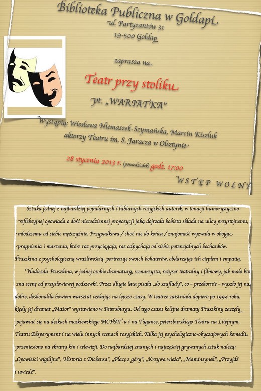 Biblioteka Publiczna w Gołdapi zaprasza 28 stycznia o godzinie 17.00 na „Teatr przy stoliku". Tym razem aktorzy teatru im. S. Jaracza w Olsztynie: Wiesława Niemaszek-Szymańska i Marcin Kiszluk przestawią sztukę Nadieżdy Ptuszkiny pt. „Wariatka".