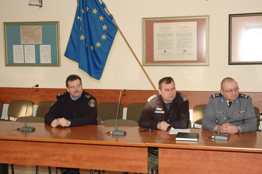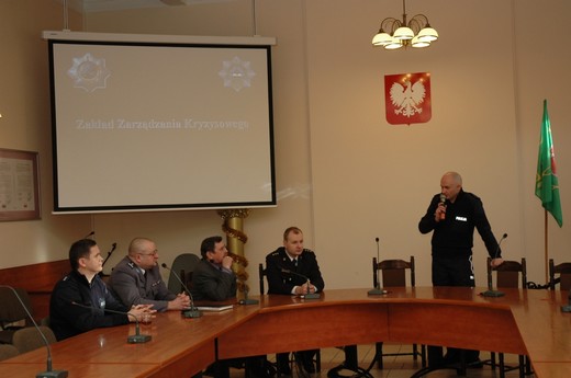 GOŁDAP. 30 stycznia w gołdapskim Urzędzie Miejskim odbyło się spotkanie, w którym udział wzięli: kierownik wydziału organizacyjnego i zarazem szef Gminnego Zespołu Zarządzania Kryzysowego Władysław Frydrych oraz przedstawiciele różnych służb mundurowych m.in. Państwowej Straży Pożarnej, Straży Granicznej, Straży Miejskiej, Policji. Wszystkich zgromadzonych przywitał komendant Komendy Powiatowej Policji w Gołdapi mł. insp. Andrzej Żyliński.