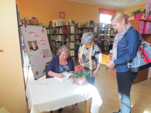 Na spotkanie przybyły zarówno osoby, które znają już twórczość Kalicińskiej, jak i takie, które wcale nie miały o niej zielonego pojęcia. Autorka okazała się osobą ujmująco otwartą, ciepłą, żywiołową, z ogromnym poczuciem humoru. Bez trudu nawiązała kontakt z uczestnikami spotkania, dużo i chętnie opowiadała, sama wręcz zachęcała do zadawania pytań. Opowiedziała historię powstania pierwszej swojej książki pt. „Fikołki na trzepaku". Zachęcała do pisania autobiografii. Spotkanie przebiegło w bardzo ciepłej atmosferze. Na koniec nie obyło się bez kwiatów i autografów.