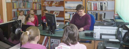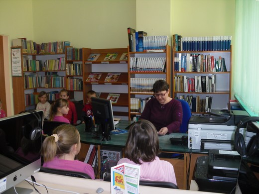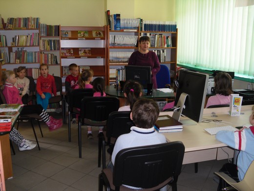Bibliotekarka Lucyna Świerzbin zapoznała małych gości z regulaminem pracowni komputerowej, czytelni i wypożyczalni. Zwróciła uwagę na poszanowanie książek i właściwe zachowanie w bibliotece.