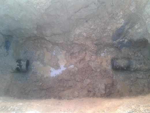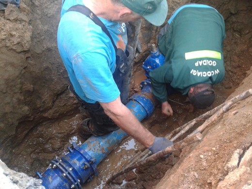 W międzyczasie przystąpiono do usuwania zaistniałej awarii. Przygotowaliśmy wszystkie niezbędne materiały na wodociąg DN 150 żeliwo (tak wynikało z posiadanych przez nas map geodezyjnych). Po wykonaniu wykopu okazało się, że jest to wodociąg DN 200 żeliwo. Takie średnice występują u nas niezwykle rzadko, mimo to znaleźliśmy część potrzebnych materiałów. Pozostałych zaczęliśmy szukać wykonując telefony do zaprzyjaźnionych firm w Olecku, Ełku, Węgorzewie i Suwałkach. Po zlokalizowaniu niezbędnych materiałów, pracownik PWiK natychmiast pojechał do Suwałk.