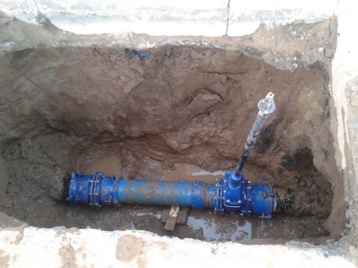 W tym czasie wykonano czynności przygotowawcze, aby po przywiezieniu materiałów jak najszybciej usunąć awarię. Wodociąg pękł wzdłuż na długości 140 cm, dlatego konieczne było wycięcie odcinka rury długości 150cm. Wszystkie kształtki, przejścia i łączniki zostały solidnie zamontowane, wstawiono również nową zasuwę sieciową DN 200.