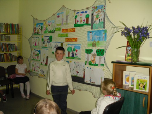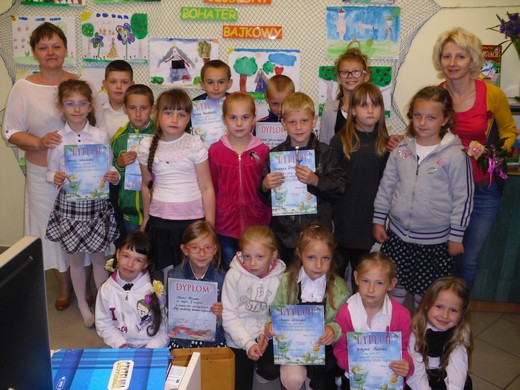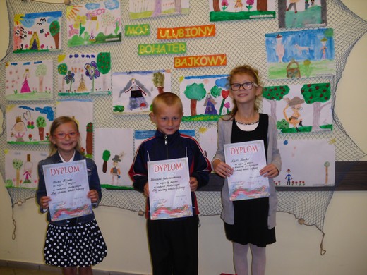 Zadanie polegało na wykonaniu pracy plastycznej w dowolnym formacie i dowolną techniką (ołówek, kredka, pastele, wycinanka, wyklejanka, oprócz grafiki komputerowej). Młodzi twórcy spisali się doskonale, wykonane ilustracje były pomysłowe, staranne i samodzielne. Ulubionymi bohaterami bajkowymi okazali się: Kot w butach, Księżniczka Zosia, Calineczka i Roszpunka. Komisja konkursowa w składzie: Maria Luto, Halina Wojtanis i Lucyna Świerzbin oceniła 18 prac. Przyznała dyplomy i nagrody następującym osobom: 1 miejsce - Nikola Trzasko, 2 miejsce - Oliwia Klimko, 3 miejsce - Kewin Gałaszewski. Podziękowanie otrzymała Beata Perżyło, wychowawczyni I klasy. Pozostałym dzieciom wręczono dyplomy i drobne upominki za udział w konkursie. Zwycięzcom serdecznie gratulujemy.