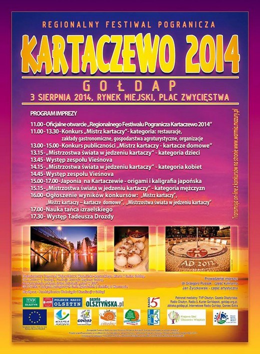 GOŁDAP. Regionalny Festiwal Pogranicza Kartaczewo 2014 odbędzie się 3 sierpnia w centrum Gołdapi. Program imprezy nie zaskakuje, jest niemal identyczny jak w poprzednich latach. Odbędą się ponownie konkursy: „Mistrz kartaczy", „Mistrz kartaczy – kartacze domowe" oraz „Mistrzostwa świata w jedzeniu kartaczy". Między nimi będą występy na scenie. Zobaczymy zespół Vieśnova oraz Tadeusza Drozdę. Szczegóły na plakacie.
