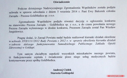 GOŁDAP. Nie będzie likwidacji spółki Goldmedica. Prezes Ewa Balcerek została odwołana ze stanowiska jej prezesa. To najważniejsze informacje z wczorajszego posiedzenia zgromadzenia wspólników Goldmedica, jakie odbyło się przed południem w Starostwie Powiatowym. Starosta Andrzej Ciołek po zebraniu wydał oświadczenie.