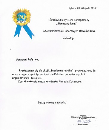 GOŁDAP. Od 1 listopada trwa trzecia edycja „Bezdomnej Kartki", zorganizowana przez Gołdapskie Stowarzyszenie Honorowych Dawców Krwi oraz Środowiskowy Dom Samopomocy „Słoneczny Dom" w Gołdapi. Już od pierwszych dni trwania akcji zaangażowali się w nią uczestnicy domu. Codziennie powstaje kilkanaście nowych kartek. Na dzień dzisiejszy mamy już ich 1067. Jak co roku dotarły przepiękne kartki wykonane przez dzieci z Rodzinnego Domu Dziecka Sylwii i Waldemara Łysakowskich z Błoni. Również serdecznie i gorąco powitaliśmy w naszym gronie nowych kartkowiczów: Mazowiecką Fundację Rodzin Zastępczych, Uniwersytet Trzeciego Wieku z Rybnika oraz panią Sylwię z Lipowej. Powoli docierają też kartki wykonane przez anonimowych kartkowiczów, za które serdecznie dziękujemy.