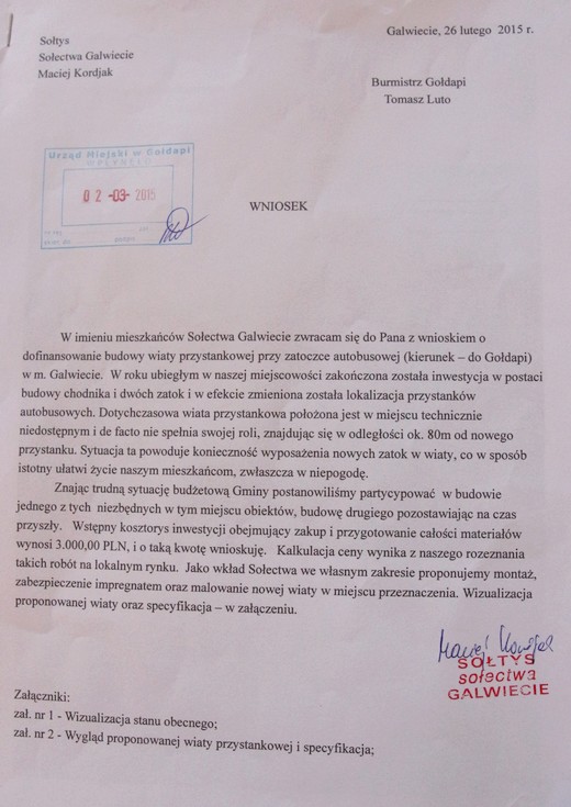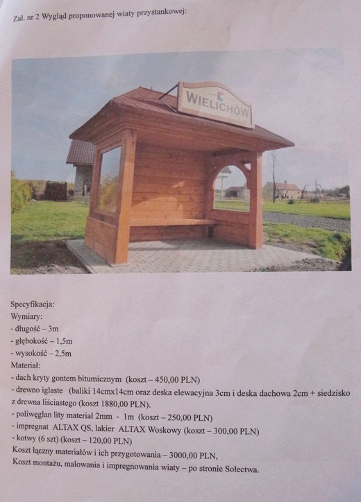 GALWIECIE. Mieszkańcy sołectwa Galwiecie chcą postawienia nowej wiaty przystankowej przy dworze wojewódzkiej nr 651. Wszystko dlatego, że po remoncie drogi zatoczka autobusowa znalazła się w innym miejscu niż była wcześniej. Starej wiaty – murowanej – przenieść się nie da. Mieszkańcy nie chcą jednak, by gmina w stu procentach samodzielnie wykonał inwestycję, chcą mieć w niej swój udział. Jako że nowa wiata ma być drewniana, proponują jej montaż, zabezpieczenie impregnatem i pomalowanie.
