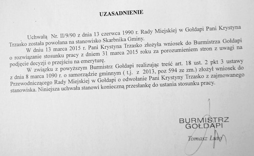 GOŁDAP. Krystyna Trzasko nie jest już skarbnikiem gminy Gołdap. Rada miejska z dniem 31 marca odwołała ją ze stanowiska. Była już skarbnik pełniła tę funkcję przez prawie 25 lat. Jak wynika z uzasadnienia do uchwały RM, do jej odwołania i zwolnienia z pracy doszło na wniosek samej zainteresowanej.