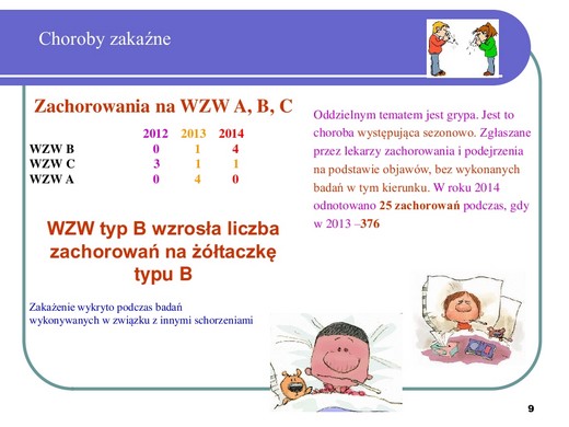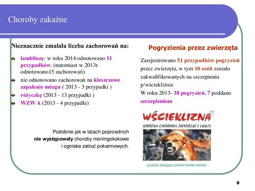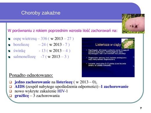 Ponad dwunastokrotnie wzrosła liczba zachorowań na ospę wietrzną. Ponad trzykrotnie wzrosła liczba zachorowań na boreliozę i świnkę. Odnotowano też jedno zachorowanie na AIDS i jedno zakażenie wirusem HIV. Znacznie spadła liczba zachorowań na grypę (2014 – 25, 2013 – 376). Wzrosła liczba zachorowań na żółtaczkę typu B.