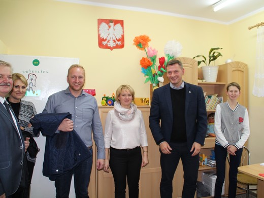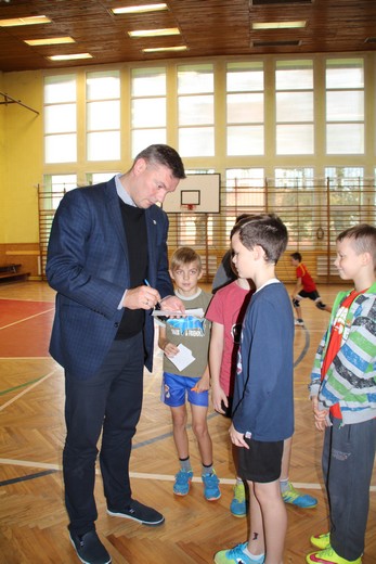 GOŁDAP. Kilka tygodni temu w Gołdapi odbył się koncert charytatywny "Wózek dla Kubusia", podczas którego prezes Polskiego Związku Piłki Siatkowej i poseł Paweł Papke wylicytował spędzenie dnia z burmistrzem Gołdapi Tomaszem Lutą. 20 października parlamentarzysta odwiedził nasze miasto. Obaj panowie udali się do Szkoły Podstawowej nr 3. Tam brali udział w niecodziennej lekcji wychowania fizycznego. Paweł Papke udzielił dzieciom kilku rad dotyczących techniki gry w siatkówkę. Wizyta zakończyła się spotkaniem z dyrektorem szkoły Leszkiem Retlem. Obaj panowie odwiedzili też Zespół Placówek Edukacyjno-Wychowawczych. Dyrektor Anna Kuskowska oprowadziła gości po szkole, ku uciesze podopiecznych, którzy żywiołowo zareagowali na spotkanie.