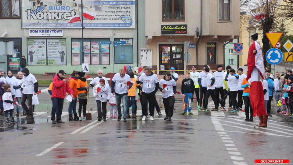 GOŁDAP. Już po raz piąty w dniu Narodowego Święta Niepodległości stowarzyszenie „Partnerstwo Sztuk” zorganizowało biegową sztafetę. Wzięło w niej udział prawie dwustu uczestników. Każdy do pokonania w dowolnym tempie miał około 100 metrów. Po biegu był czas na grochówkę, Na koniec sztafety organizator przygotował niespodziankę - jubileuszowy tort.