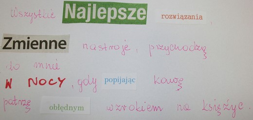 Po transmisji on-line uczestnikom zaproponowano ćwiczenie z artecoachingu tj. formy pracy nad rozwojem, która wykorzystuje wszelkie formy sztuki oraz ludzką kreatywność i potrzebę autoekspresji. Ćwiczenie „wiersz niecodzienny” miało charakter literacki, a jego celem było stworzenie wiersza. Chodziło o to, by sprowokować refleksję nad codziennością oraz dotrzeć do zasobów twórczości poetyckiej. Uczestnicy wylosowali białą kartkę z zapisanym wyrażeniem, które miało nadać kierunek wiersza. Mieli do wyboru słowa z rozsypywanki, za pomocą których mogli zainspirować się w dalszym tworzeniu wiersza. Niektórzy z obawą podjęli się realizacji zadania, stwierdzając, że nie są przecież poetami. Okazało się jednak, że udało im się napisać (niektórym pierwszy w swoim życiu) wiersz. Jedna z pań była z siebie tak dumna, że zabrała wiersz do domu mówiąc, że oprawi go i zawiesi na ścianie!