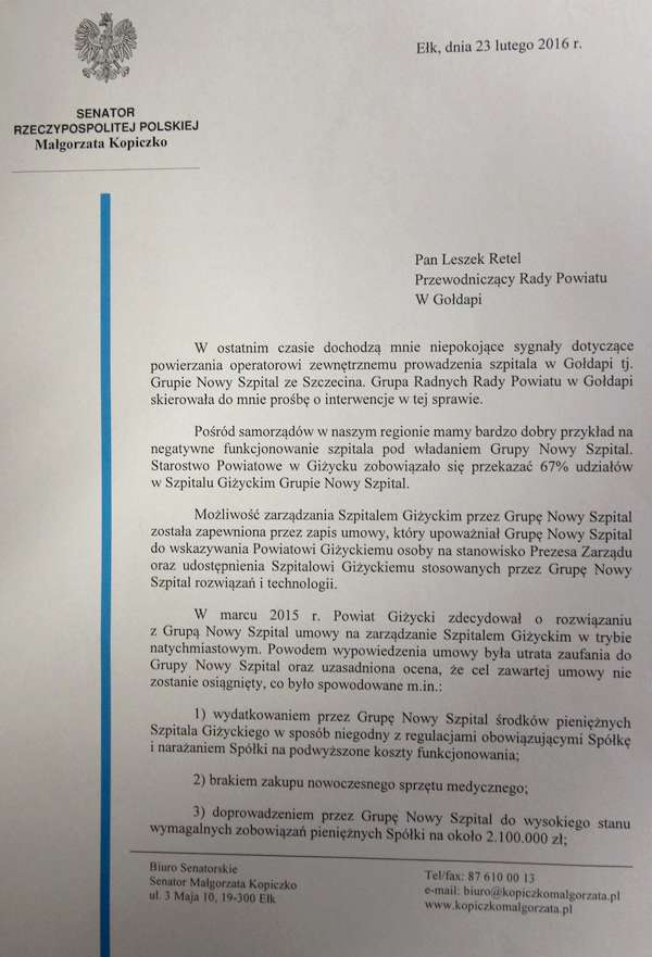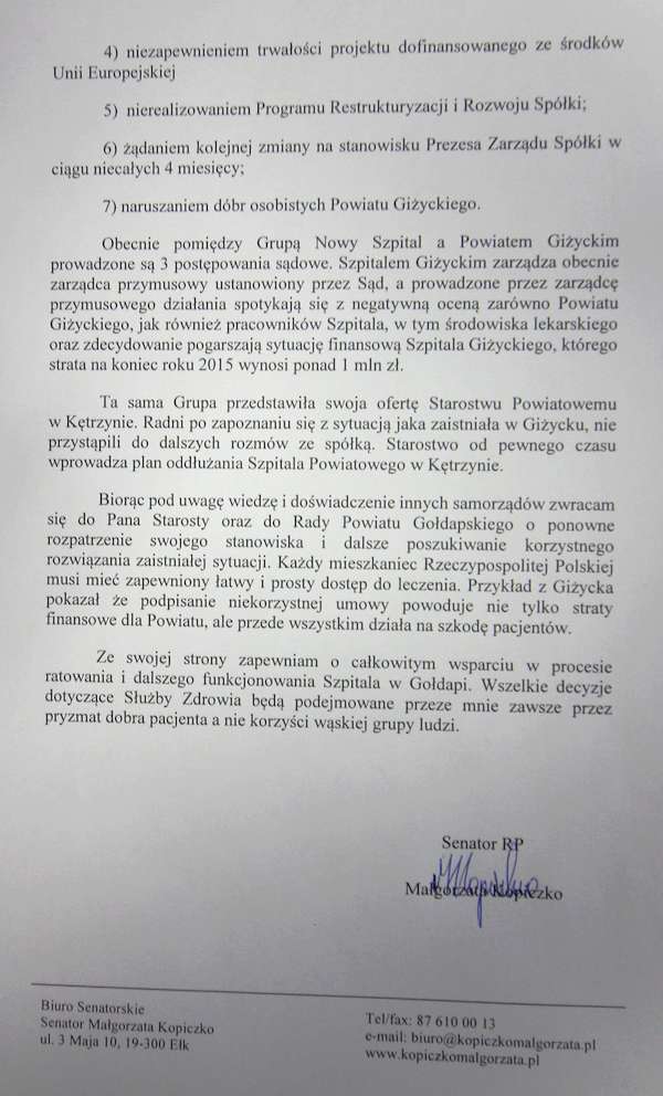 Temat szpitala został też poruszony w rozmowie ze starostą. Senator zapewniła go o swoim wsparciu w tym temacie. Radnym rady powiatu przekazała swoje oświadczenie ws. szpitala, które zostało odczytane przez Piotra Miszkiela w miniony czwartek na sesji rady powiatu.