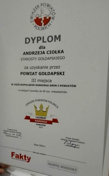 Podczas posiedzenia uroczyście uhonorowano dyplomami i nagrodami laureatów Ogólnopolskiego Rankingu Gmin i Powiatów prowadzonego przez Związek Powiatów Polskich. Powiat gołdapski w kategorii powiaty do 60 tys. mieszkańców zajął znakomite trzecie miejsce. Starosta przyjmując puchar podkreślił, iż jest to sukces wielu osób i tytuł ten dedykuje wszystkim mieszkańcom powiatu gołdapskiego.