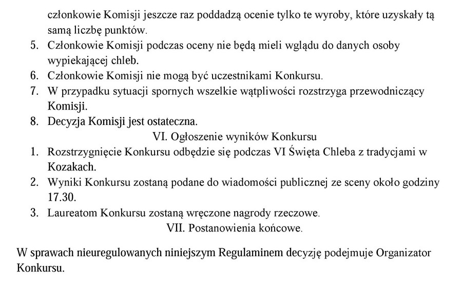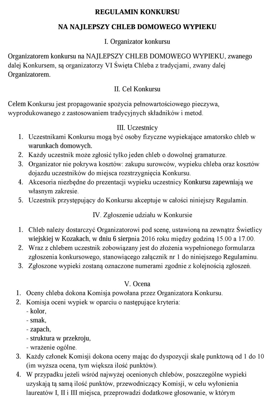 KOZAKI. W najbliższą sobotę w Kozakach odbędzie się VI Święto Chleba. W jego trakcie odbędzie się konkurs na najlepszy chleb domowego wypieku. Przedstawiamy państwu regulamin tego konkursu.