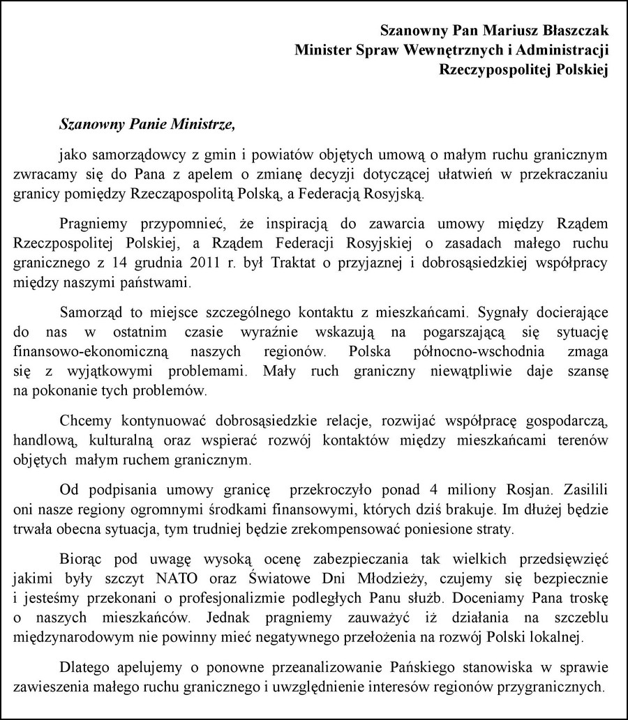 GOŁDAP. Burmistrz Gołdapi zbiera podpisy wśród samorządowców pod projektem pisma z apelem o przywrócenie małego ruchu granicznego z Rosją. Pismo to ma potem trafić do ministra spraw wewnętrznych i administracji. Wczoraj podczas posiedzenia jednej z komisji rady miejskiej Tomasz Luto poinformował, że już ponad 40 włodarzy z regionu zadeklarowało złożenie swoich podpisów, a 17 to uczyniło. Wśród deklarujących nie ma jednak starosty gołdapskiego.