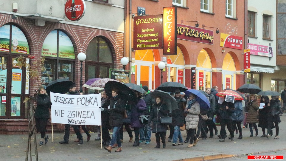 Na początku „czarnego spaceru” odczytane zostało pismo, jakie zostanie skierowane do wojewody, a także przedstawione zostały powody, dla których po raz drugi odbywają się dziś w całym kraju protesty kobiet. Następnie uczestnicy manifestacji przeszli dwukrotnie wokół pl. Zwycięstwa, niosąc transparent z napisem „JESZCZE POLsKA NIE ZGINĘŁA GOŁDAP”. „Czarny spacer” zakończył się wspólną kawą.