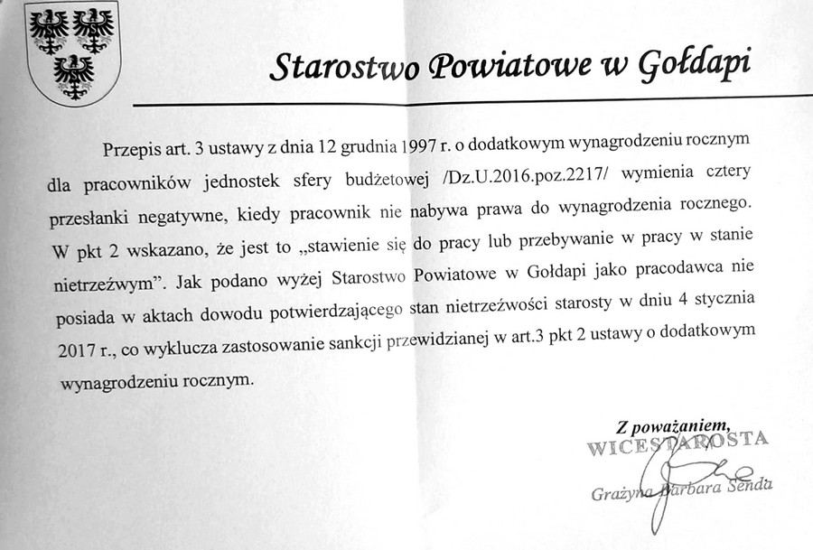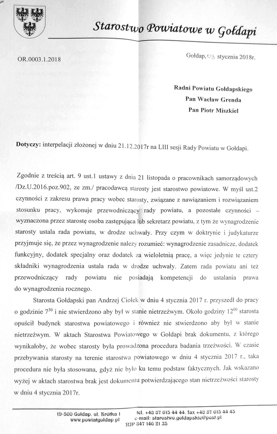 Do radnych trafiła już odpowiedź na złożoną interpelację. Udzieliła jest wicestarosta Grażyna Senda. Wynika z niej, że nie stwierdzono, by 4 stycznia 2017r. starosta Andrzej Ciołek był w pracy w stanie nietrzeźwym. Brak jest bowiem dokumentów, które by to potwierdzały.