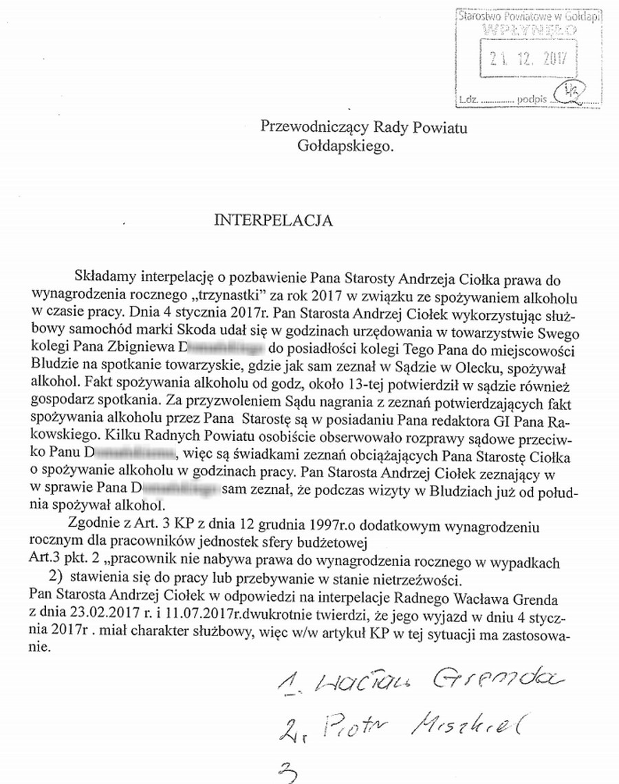 GOŁDAP. Radni Wacław Grenda i Piotr Miszkiel złożyli interpelację ws. pozbawienia Andrzeja Ciołka prawa do tzw. „trzynastki” za rok 2017. Argumentują to spożywaniem przez niego alkoholu w czasie pracy. Miało do tego dojść 4 stycznia ubiegłego roku podczas wyjazdu starosty na teren gminy Dubeninki. To tego dnia wieczorem skradziona została służbowa skoda Starostwa Powiatowego w Gołdapi. Podczas rozprawy sądowej dotyczącej tej właśnie sprawy zeznawały m.in. osoby, które tego dnia odwiedził. Wynika z nich, że uczestnicy spotkań, w tym Andrzej Ciołek, spożywali alkohol.