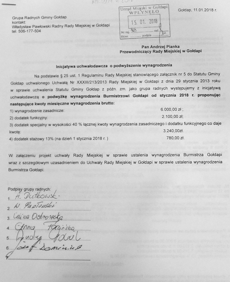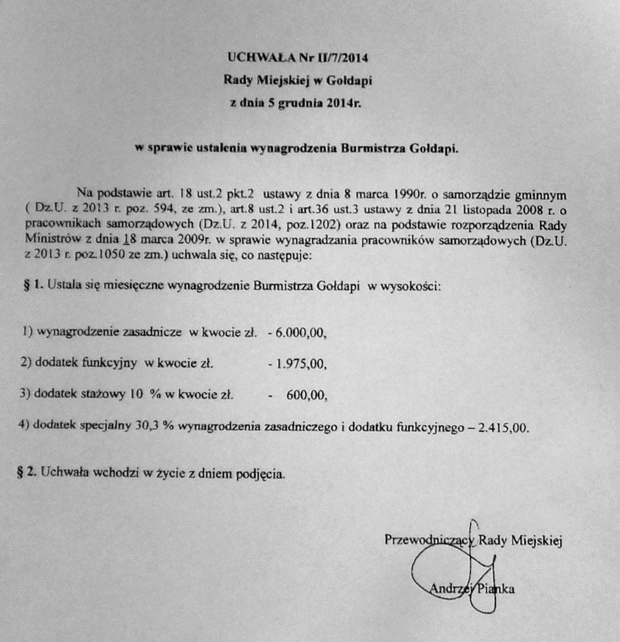 GOŁDAP. Sześcioro radnych miejskich przygotowało projekt uchwały w sprawie zmiany wynagrodzenia burmistrza Gołdapi. Zgodnie z nim Tomasz Luto miałby zarabiać 950 złotych brutto miesięcznie więcej niż dotychczas.