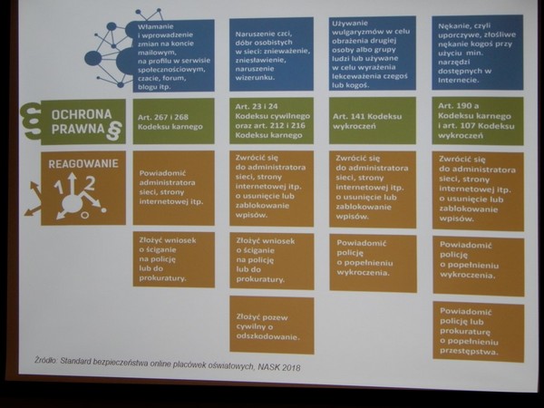 W trakcie spotkania szeroko mówiono o tym, czym jest cyberprzemoc, jakie są formy cyberprzemocy oraz co może być skutkiem stosowania tego rodzaju agresji. Poruszono również tematy związane z prawnymi aspektami stosowania cyberprzemocy zarówno w oparciu o kodeks karny jak również przepisy prawa cywilnego. Dużą uwagę poświęcono szerokorozumianemu bezpieczeństwu w internecie.