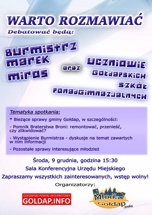Młodzież to przyszłość naszego kraju. Ma swoje zdanie i poglądy na wszystko. Jeśli chcesz poznać zdanie gołdapskiej nastolatków na sprawy lokalne, zapraszamy na spotkanie pt. „Warto rozmawiać". Przy stole dyskusyjnym zasiądą uczniowie z gołdapskich szkół ponadgimnazjalnych, burmistrz Gołdapi Marek Miros oraz kierownicy wydziałów w Urzędzie Miejskim. Tematem pierwszego spotkania będzie między innymi Pomnik Braterstwa Broni na Placu Zwycięstwa. Uczestnicy wspólnie zastanowią się, co powinno się z nim zrobić w obliczu groźby otrzymania przez Urząd Miejski nakazu jego rozbiórki. Poruszone zostaną też inne, interesujące tematy.