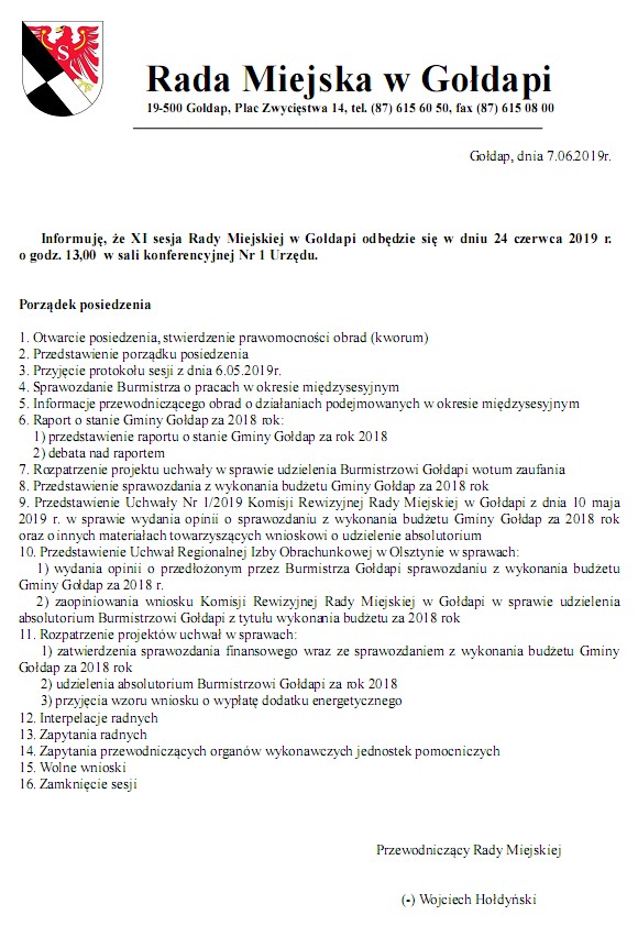 XI sesja rady miejskiej w Gołdapi - planowany porządek obrad