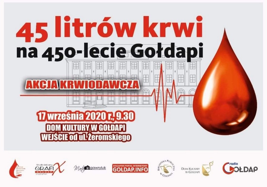 GOŁDAP. Gołdapskie Stowarzyszenie Honorowych Dawców Krwi zaprasza do udziału we wrześniowej akcji krwiodawczej. Odbędzie się ona jutro w Domu Kultury w Gołdapi (wejście od ul. Żeromskiego). Początek o godzinie 9:30.