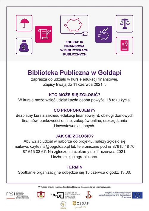 - Aby wziąć udział w naborze do projektu „Edukacja finansowa w bibliotekach publicznych”, należy zgłosić się mailowo (czytelnia@bpgoldap.pl) lub telefonicznie (87-615-48-70, 87-615-03-67). Na zgłoszenia czekamy do 11 czerwca 2021r. Liczba miejsc ograniczona.