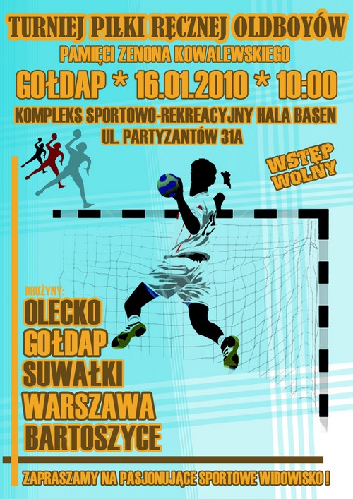 W sobotę 16 stycznia na hali sportowej w Kompleksie Sportowo-Rekreacyjnym w Gołdapi odbędzie się turniej piłki ręcznej oldboyów, poświecony pamięci Zenona Kowalewskiego. W zawodach wezmą udział drużyny z Warszawy, Bartoszyc, Gołdapi, Olecka oraz Suwałk. Organizator - Romuald Piechociński - zaprasza na wyśmienite sportowe widowisko. Początek o godzinie 10:00, wstęp bezpłatny.