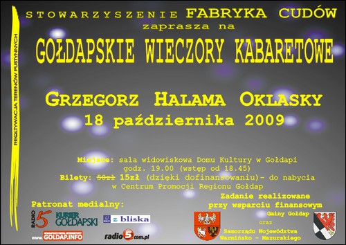 Mamy dla Państwa dwa bilety na występ kabaretu "Grzegorz Halama Oklasky". Otrzymają je osoby, które jako pierwsze zgłoszą się w środę i w czwartek do naszej redakcji i podadzą hasło "KABARET". Zapraszamy!
