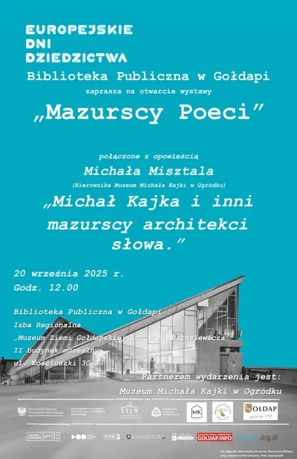 Biblioteka Publiczna w Gołdapi zaprasza 20 września o godzinie 12:00 do Izby Regionalnej „Muzeum Ziemi Gołdapskiej im. M. M. Ratasiewicza” na otwarcie wystawy pt. „Mazurscy Poeci”.