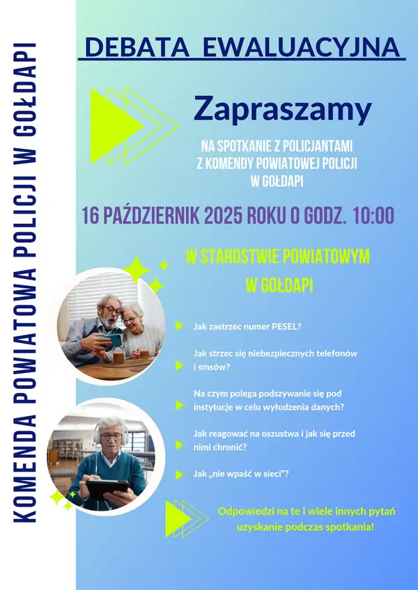 16 października  w Starostwie Powiatowym w Gołdapi lokalna policja organizuje spotkanie z mieszkańcami ph. „Porozmawiajmy o bezpieczeństwie - Możesz mieć na nie wpływ. Bezpieczny senior”.