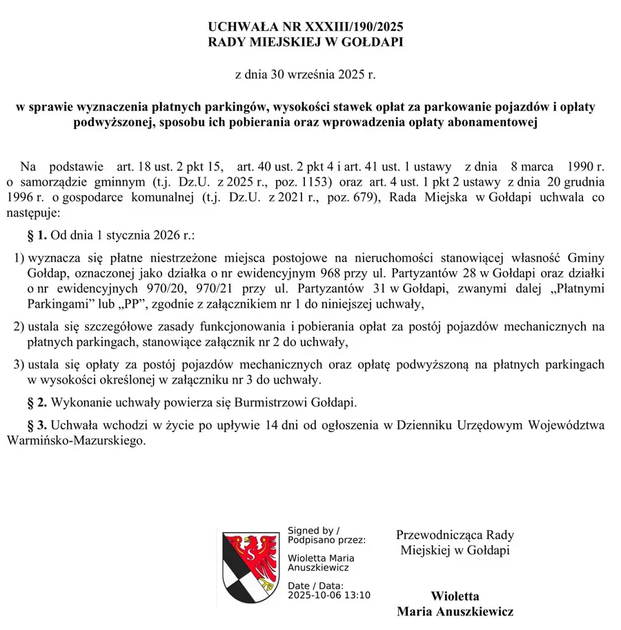 Uchwała ws. płatnych parkingów wejdzie w życie po upływie 14 dni od opublikowania jej w Dzienniku Urzędowym Województwa Warmińsko-Mazurskiego. Do chwili publikacji tego materiału nie została ona jeszcze opublikowana.