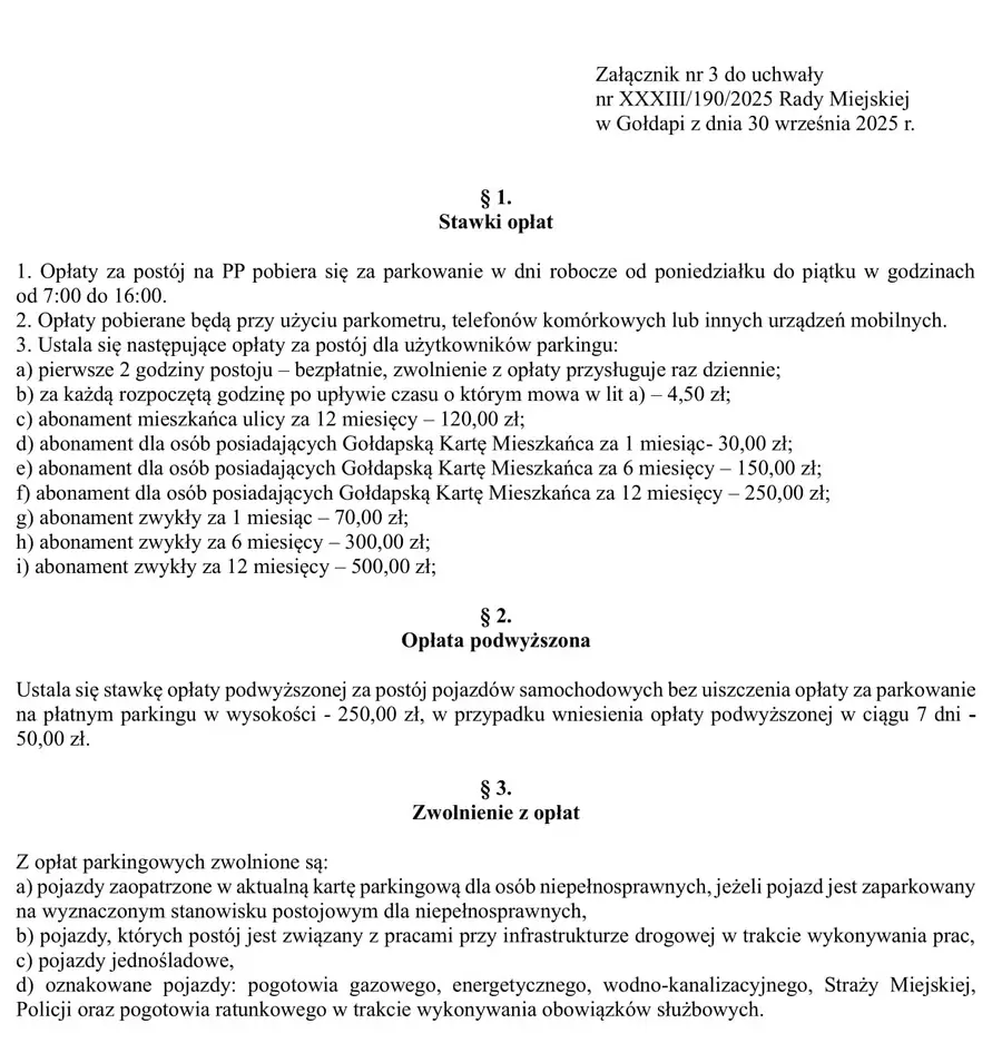 Uchwałę w sprawie wprowadzenia opłat podjęła jednogłośnie rada miejska w Gołdapi na posiedzeniu 30 września. Za głosowali: Maciej Kordjak, Wioletta Anuszkiewicz, Andrzej Dołęga, Wojciech Hołdyński, Zbigniew Makarewicz, Paweł Nawrocki, Paweł Perko, Janina Pietrewicz, Tomasz Popławski, Zofia Syperek i Marcin Urzędowski. Czworo pozostałych radnych było nieobecnych.