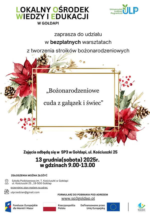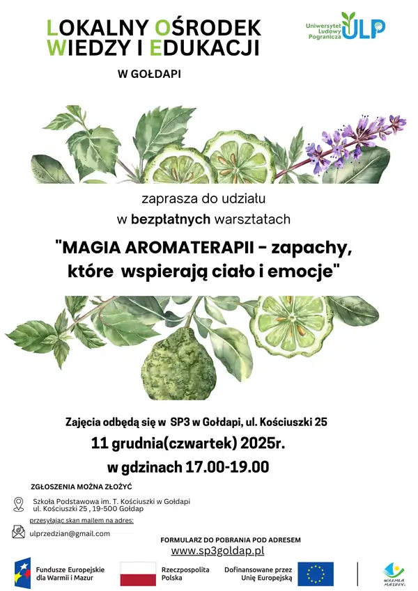 Odbędą się one będą w Szkole Podstawowej nr 3 w Gołdapi. 11 grudnia w godzinach 17:00-19:00 odbędzie się warsztat pt. „Magia aromaterapii - zapachy, które wspierają ciało i emocje”. Dwa dni później w godzinach 9:00-13:00 zajęcia będą dotyczyć tworzenia stroików bożonarodzeniowych.