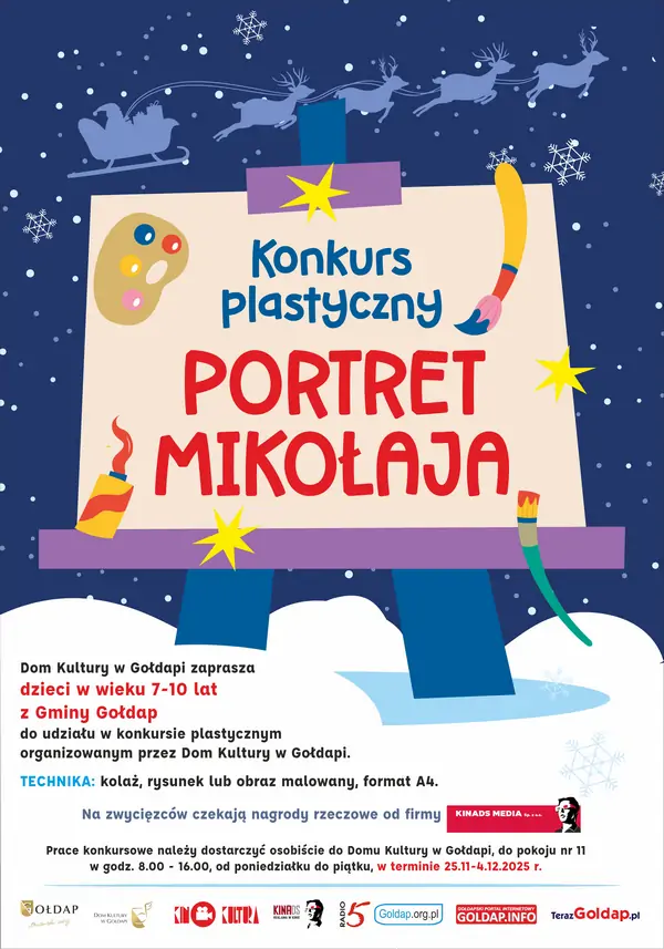 Konkurs jest skierowany do dzieci w wieku 7-10 lat z gminy Gołdap. Uczestnik ma za zadanie wykonać pracę plastyczną w formacie A4 (kolaż, rysunek lub obraz malowany farbami) pt. „Portret mikołaja.”