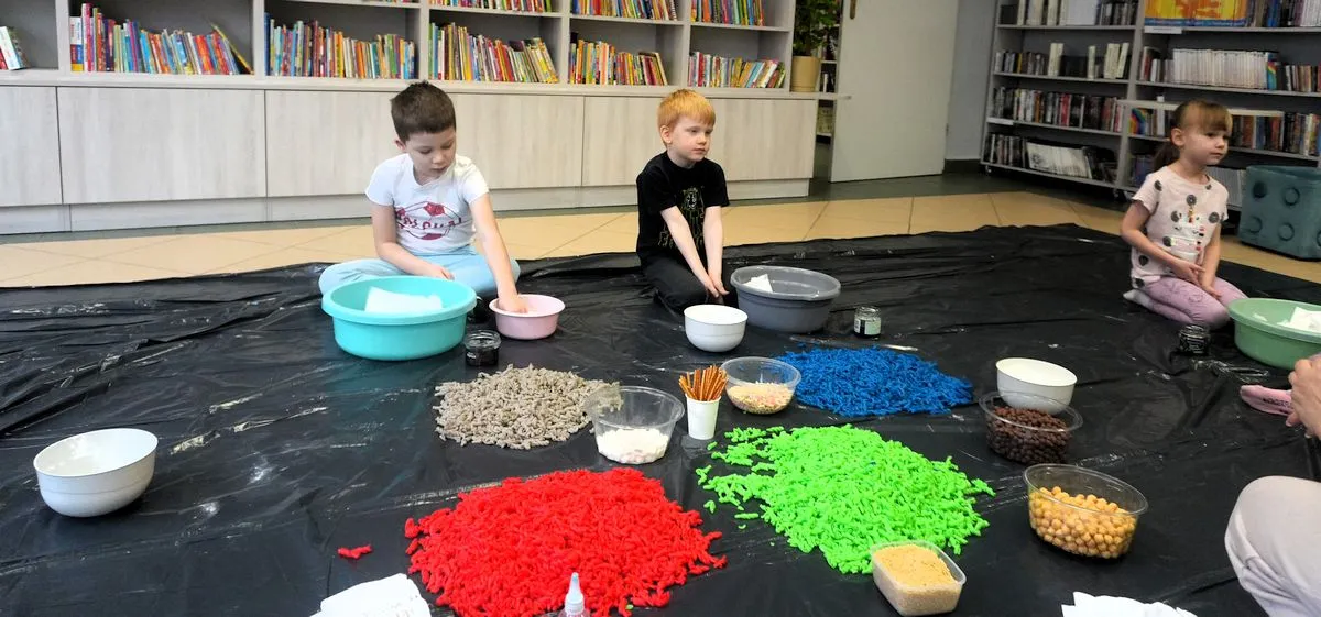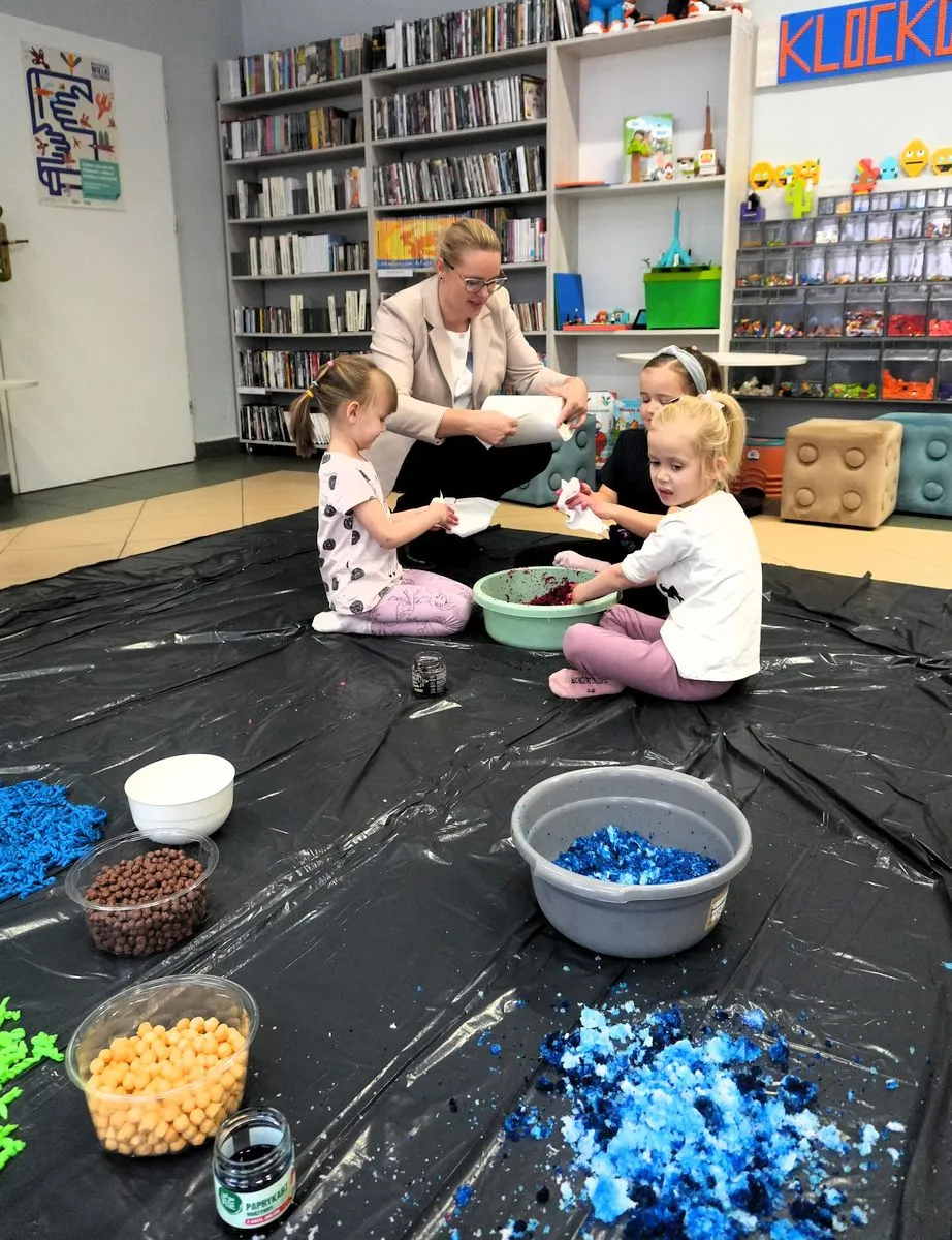 Każde spotkanie przynosiło dzieciom nowe doświadczenia i mnóstwo uśmiechu. Podczas „zimowych poranków” uczestnicy warsztatów sensoplastycznych tworzyli obrazy do bajki o „Misiu Śniegulku”, swobodnie eksperymentując z różnorodnymi materiałami, rozwijając wyobraźnię, zmysły i sprawność manualną. Ogromnym zainteresowaniem cieszyło się również interaktywne auto, które zachęcało do ruchu, odkrywania i wspólnej zabawy.