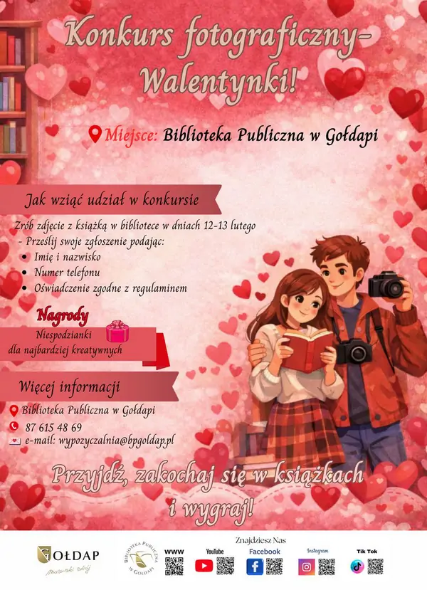 Biblioteka Publiczna w Gołdapi i Gołdapski Uniwersytet Trzeciego Wieku zapraszają na montaż słowno-muzyczny z okazji walentynek pt. "Miłość ma zapach poezji i piosenki".