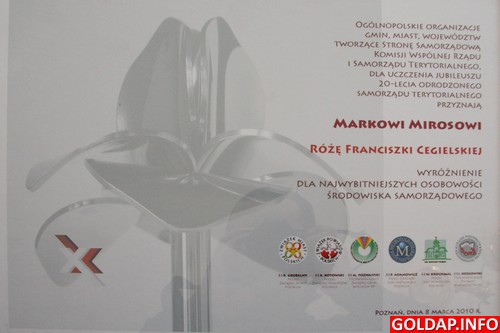 Podczas kongresu burmistrz Gołdapi wyróżniony został dwiema nagrodami. Jedną z nich jest porcelanowy puchar z jego imieniem i nazwiskiem. Związek Miast Polskich uhonorował w ten sposób tych, którzy od początku reformy samorządowej nieprzerwanie sprawują funkcję burmistrzów. Drugą nagrodą jest Róża im. Franciszki Cegielskiej. Była ona pierwszym prezydentem Gdyni oraz członkiem zarządu Związku Miast Polskich. Później została ministrem zdrowia. Niestety, jej karierę przerwała śmierć. Obok zmarłych Waleriana Pańki i Grzegorza Palki, jest zaliczana do wzorców samorządowca. Nagrodę im. Franciszki Cegielskiej otrzymało jeszcze kilkanaście osób, w tym prezydent Poznania Ryszard Grobelny oraz prezydent Gdyni Wojciech Szczurek.