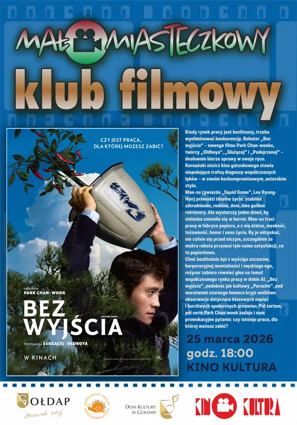 Tym razem na ekranie zobaczymy film „Bez wyjścia” (reż. Park Chan-Wook) - poruszającą historię o człowieku, którego dotychczas uporządkowane życie zaczyna się nagle rozpadać. W obliczu utraty stabilności i narastającej presji bohater zostaje zmuszony do konfrontacji z własnymi wyborami, ambicjami i granicami, których wcześniej nie musiał przekraczać. To film skłaniający do refleksji nad współczesnym światem, odpowiedzialnością oraz ceną, jaką czasem płacimy za swoje decyzje.
